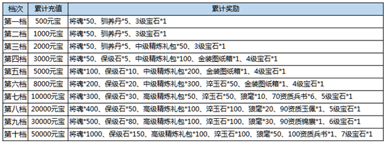 活动期间充值元宝计入累计充值,活动结束后统计累计充值,达成累计充值条件可领取对应累计奖励!